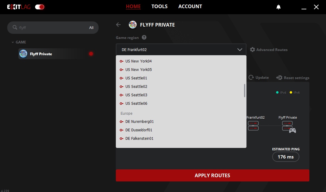 Step 5: Once you open the application, search for flyff private and choose your game region near the game's host then click apply routes.