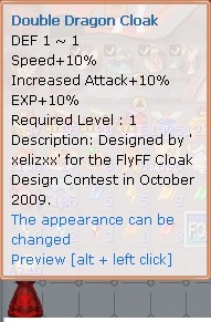 f. EXP Cloak or the Double Dragon Cloak - a cloak that gives an additional 10% experience.
