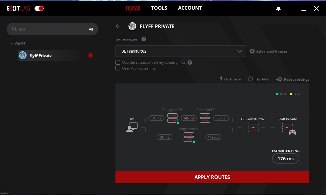 Step 5: Once you open the application, search for flyff private and choose your game region near the game's host then click apply routes.